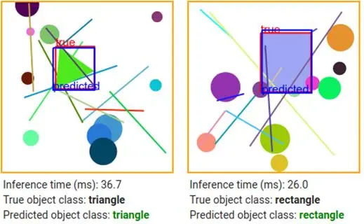 微调结束后,将模型保存到磁盘,然后在浏览器内推断步骤(由yarn watch命令启动)中加载。如果加载托管模型,或者已经花费时间和资源在自己的计算机上训练了一个相当好的模型,那么在推断页面中看到的形状和边界框预测应该相当好(初始训练100个阶段,精调200个阶段后的验证损失小于100)。推断结果良好,但并不完美(例如,参见图5.14中的示例)。在检查结果时,请记住浏览器内评估是一个公平的评估,它反映了模型的真正泛化能力,因为在浏览器中受训的模型要解决的示例不同于它在迁移学习过程中看到的训练和验证示例。
