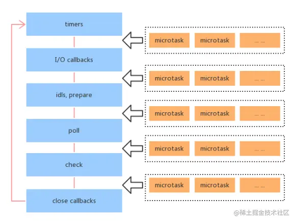 - 在事件循环的每一个子阶段退出之前都会检查是否有 process.nextTick 回调、是否有 microtaks并执行