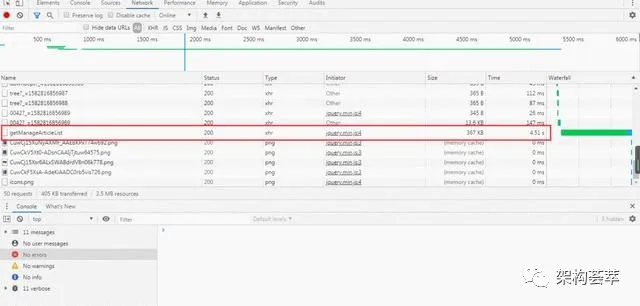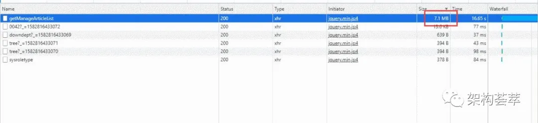 于是我用 F12 打开 chrome 调试工具,发现获取新闻内容列表数据的 API 接口:“getManageArticleList" 接收的数据有 7.1 M,接口响应时间长达 16 秒多,太不正常了。