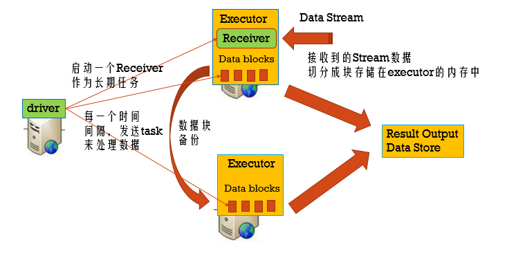 之后Driver就会发送Receiver到某一个Executor上面,Receiver就是负责用来接收数据的(你也可以当成是一个task任务)。它每隔200毫秒就会将自己接收上来的数据存储成一个block,而且这个block肯定就会有副本机制。