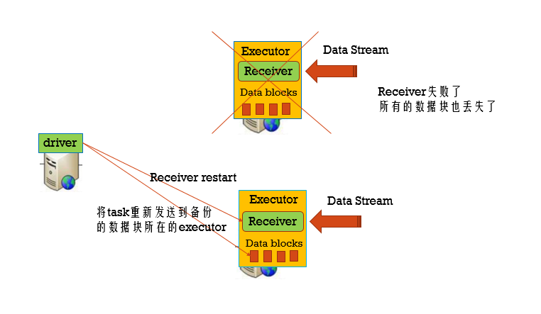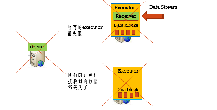 首先我们图中下方的Executor挂掉,那是完全不碍事的,因为所有的数据都在上面的Executor中,可是当上方的Executor也挂掉的话,它的Receiver自然就无法正常工作了,那数据就会丢失了。