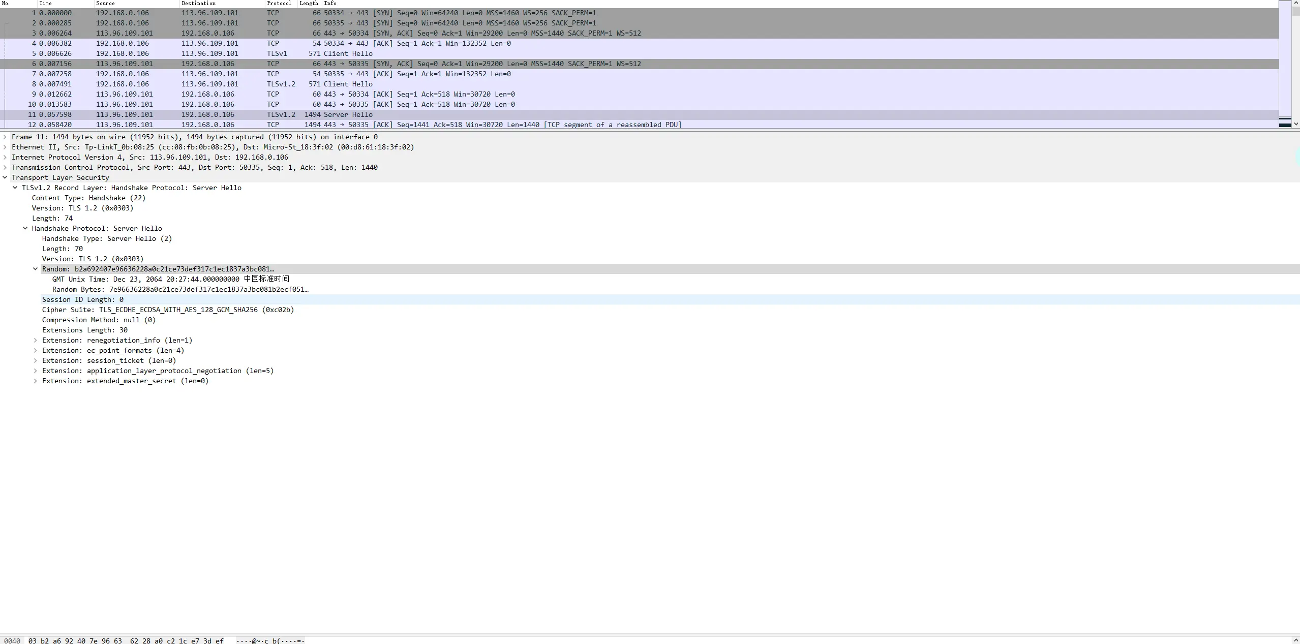 - B告之A,B所采用的tls版本,压缩算法、加密算法,以及随机数b[Server Hello]