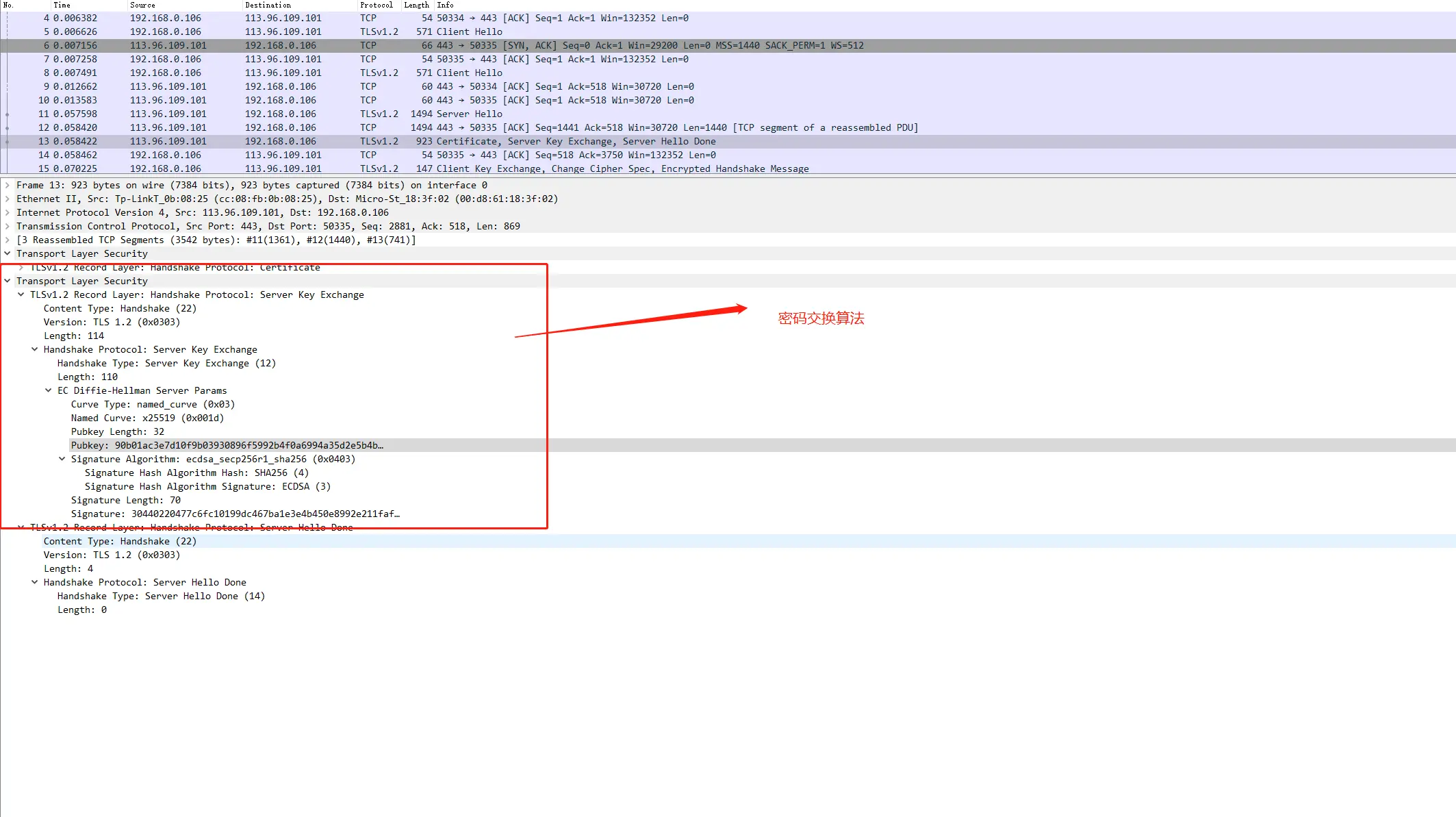 - Certificate,Server key exchange、Server Hello Done。见上文HTTPS的解决方案第3步,服务器除了传递证书外,还告诉客户端密钥交换算法所需的参数;