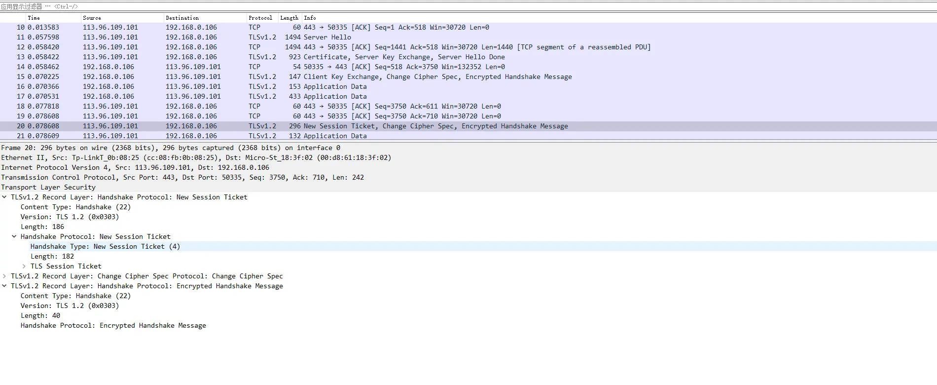 - 见上文HTTPS的解决方案第5步。S端根据C端传递的密钥交换算法参数,得到公钥,尝试握手。同事要求客户端用New Session Ticket(已经协商好的对称密钥)保存会话的相关信息,New Session Ticket是用只有S端才能解密的的公钥加密的。下次通信过程中,服务端如果可以根据New Session Ticket成功解密,就可以迅速握手。