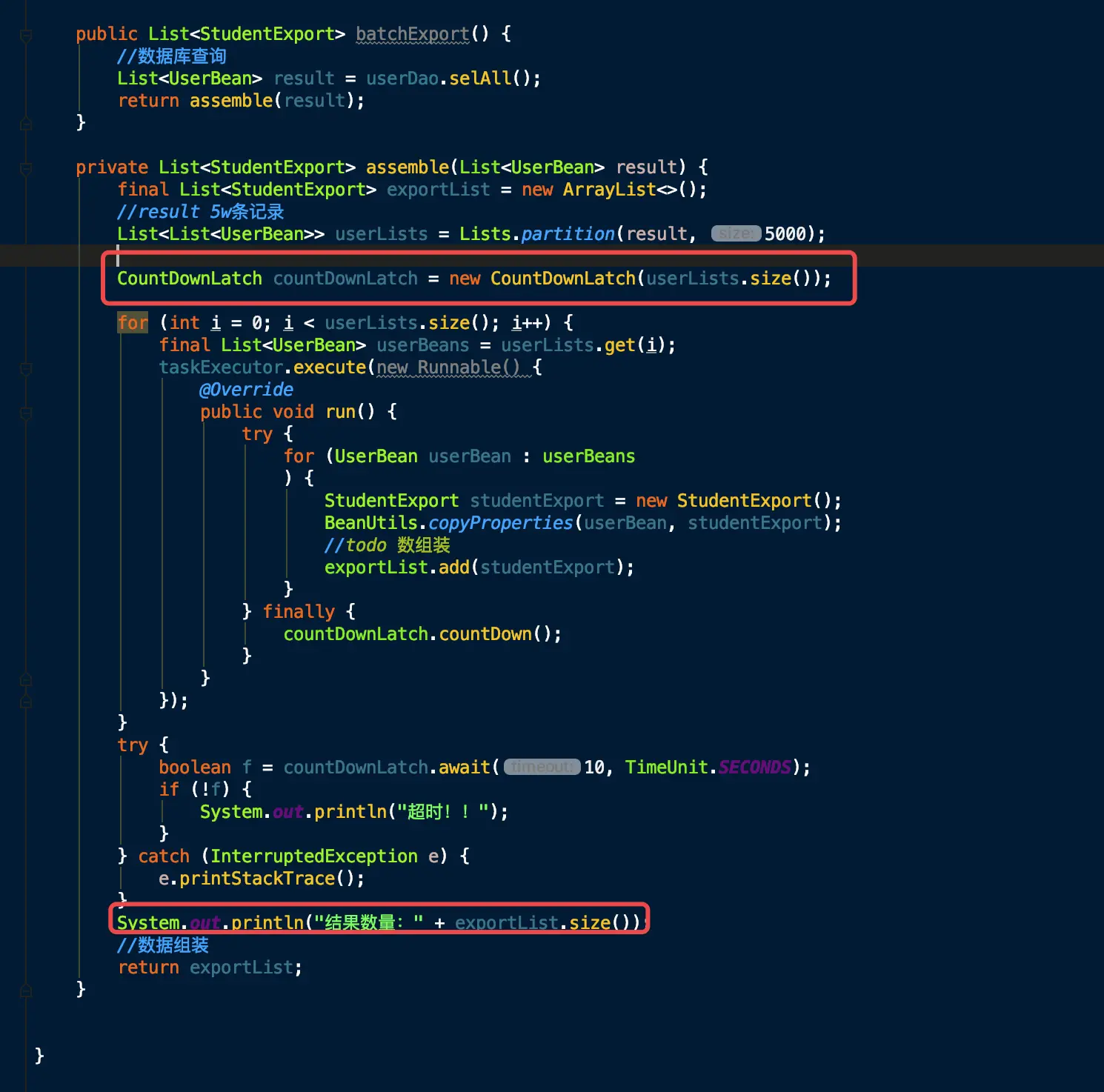 开发过程中为了提高性能使用了多线程,并用CountDownLatch计数器确保任务全部完成后返回结果。但是结果仍然产生了偏差,51879条记录只导出51678条,数据丢了! 使用了volatile修饰变量 不可行,最终使用锁在exportList.add(model)加锁。