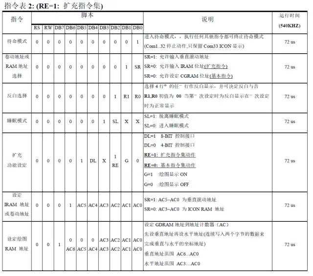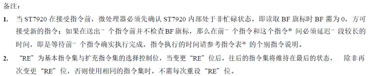 ST7920指令集分为2种,第一种:10种基础指令集RE=0,第二种:6种高级指令集RE=0