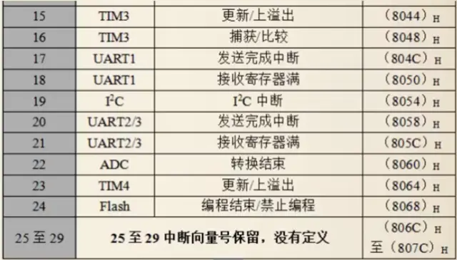从0X005050开始到0X0057FF结束的区间内存储的是外设的寄存器。包括:flash、ITC终端资源、RST复位、CLK时钟、WWDG窗口看门狗、IWDG独立看门狗、AWU自动唤醒单元、BEEP蜂鸣器、SPI、I2C、UART、TIM定时器、ADC、beCAN等。