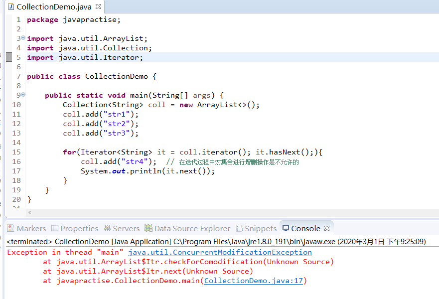 coll.add("str4"); // 在迭代过程中对集合进行增删操作是不允许的