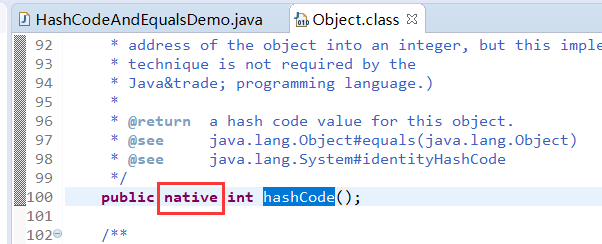 - Object类中的hashCode()方法是用native修饰的,表示使用的不是java语言实现的方法。