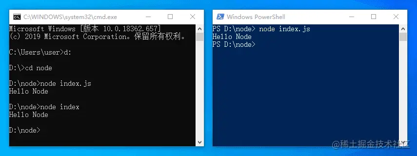 4. 运行js文件:在D盘新建node文件夹,node内部新建index.txt,输入console.log('Hello Node'),保存,重命名为index.js,有两种方法执行该文件: