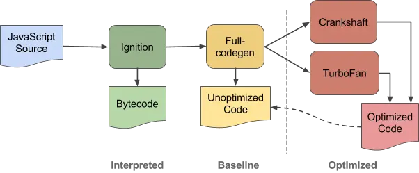 在V8的5.9版本出来之前,引擎使用两种编译器(后续版本中已经使用TurboFan 替代了前两者, 这里终于原文进行翻译,最新的编译器大家请点前面的连接来学习):