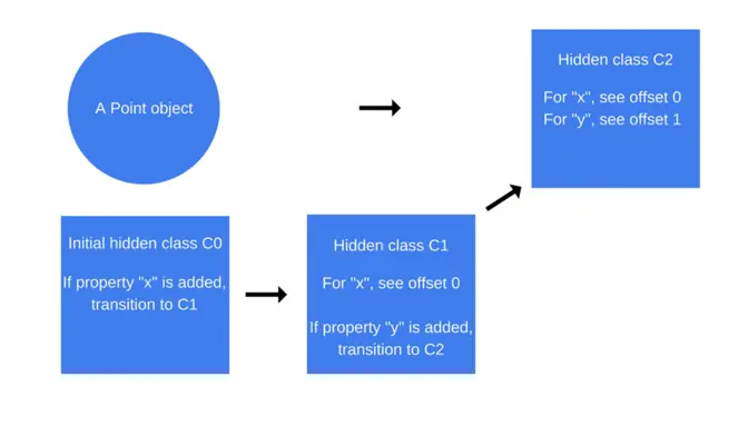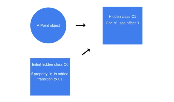 每次新属性添加到对象中,旧的隐藏类将会转换为新的隐藏类。隐藏类转换非常重要,因为它们允许隐藏类在以相同方式创建的对象之间进行共享。如果两个对象共享一个隐藏类,并且向它们两个都添加了相同的属性,则类转换将确保两个对象都接收到相同的新隐藏类以及后续的优化代码。