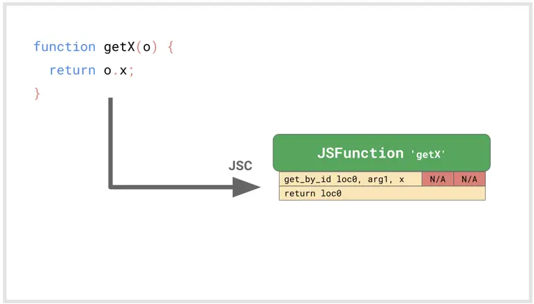 现在假设我们使用对象{x:'a'}调用getX。该对象的Shape具有属性“x”,并且Shape存储该属性x的偏移量和属性。首次执行该函数时,get_by_id指令查找属性“x”并发现该值存储在偏移量0处。