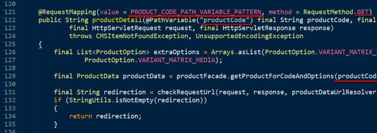 Hybris team的同事张健在他写的公众号文章从产品展示页面谈谈Hybris的特有概念和设计结构里介绍了product detail page的controller是如何被调用到的。