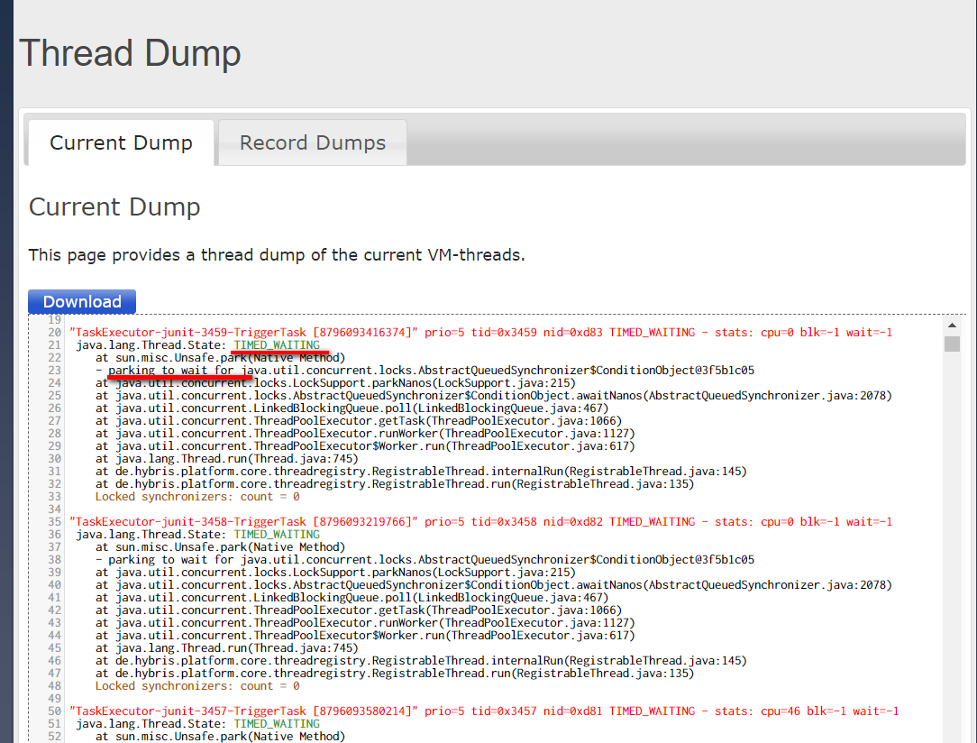 ConditionObject.awaitNanos(AbstractQueuedSynchronizer.java:2078) at java.util.concurrent.LinkedBlockingQueue.poll(LinkedBlockingQueue.java:467) at java.util.concurrent.ThreadPoolExecutor.getTask(ThreadPoolExecutor.java:1066) at java.util.concurrent.ThreadPoolExecutor.runWorker(ThreadPoolExecutor.java:1127) at java.util.concurrent.ThreadPoolExecutor$Worker.run(ThreadPoolExecutor.java:617) at java.lang.Thread.run(Thread.java:745) at de.hybris.platform.core.threadregistry.RegistrableThread.internalRun(RegistrableThread.java:145) at de.hybris.platform.core.threadregistry.RegistrableThread.run(RegistrableThread.java:135) Locked synchronizers: count = 0 这个功能相当于ABAP的SM50里双击某个dialog process看到的detail callstack。