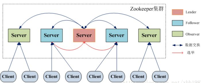 但是,在 ZooKeeper 中没有选择传统的 Master/Slave 概念,而是引入了Leader、Follower 和 Observer 三种角色。如下图所示