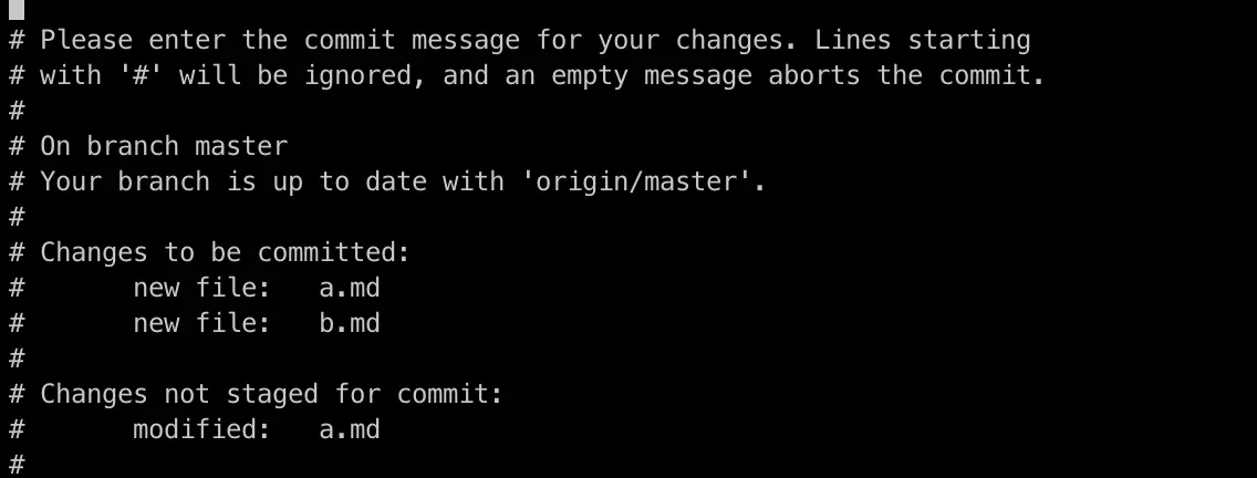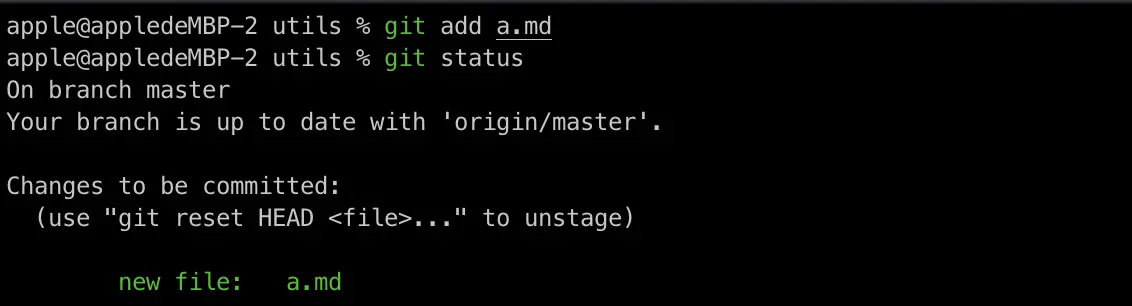 新建的a.md文件出现在Untracked files下面。未跟踪文件是git在之前的快照中没有的文件。git不会自动将其纳入跟踪范围,需要手动增加。