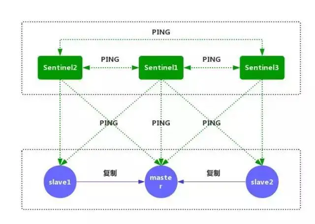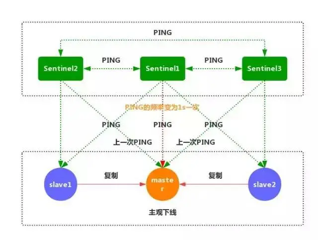 ①每个 Sentinel 节点都需要定期执行以下任务:每个 Sentinel 以每秒一次的频率,向它所知的主服务器、从服务器以及其他的 Sentinel 实例发送一个 PING 命令。(如上图)