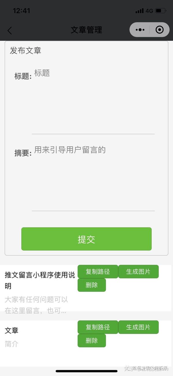 使用说明:在小程序中新增文章,然后点击复制文章路径和生成图片保存到本地。