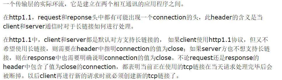 若Connection模式为close,则服务器主动关闭TCP连接,客户端被动关闭TCP连接,释放TCP连接.若Connection为keepalive,则该连接会保持一段时间,该时间内可以持续使用该连接接收请求,做出响应