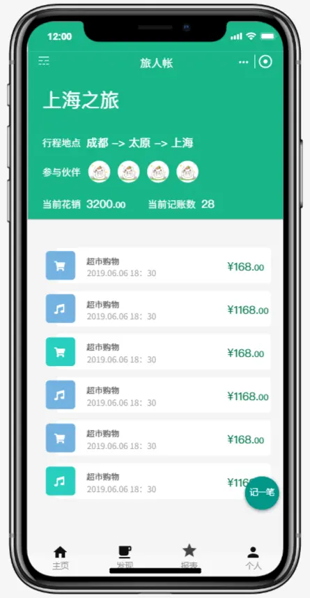 当用户创建一个行程时,则证明该旅程的账单已经被开启了。创建该行程的用户被认定为管理员,他可以添加参与该行程的小伙伴。所有参与行程的小伙伴,都可以在旅行的过程中记账(比如小伙伴C和小伙伴A吃了一顿火锅花了300块钱,小伙伴C则可以记入本笔开销,而该笔开销的参与者是小伙伴C和A),当大家旅行完成了之后就可以进行结算,将费用平摊到每个人身上,谁需要补钱,谁需要退钱等都可以被该应用计算出来。