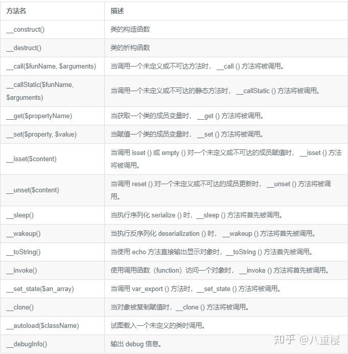 在 PHP 中,以双下划线(__)开始命名的方法被称作 PHP 中的魔术方法,它们在 PHP 中充当很重要的角色。魔术方法包括: