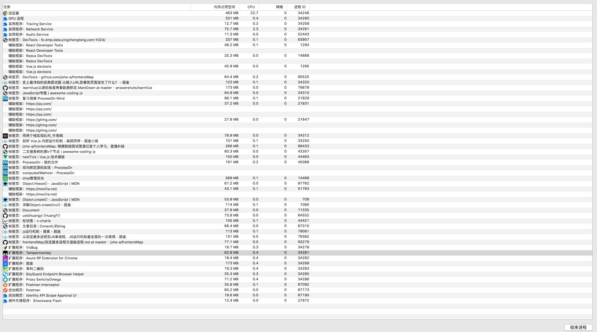 每打开一个tab页,相当于创建了一个独立的浏览器渲染进程 通过右上角->更多工具->任务管理器可以查看到: