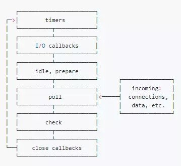 外部输入数据->轮询阶段(poll)->检查阶段(check)->关闭事件回调阶段(close callback)->定时器检测阶段->I/O事件回调阶段->闲置阶段(idle,prepare)->轮询阶段