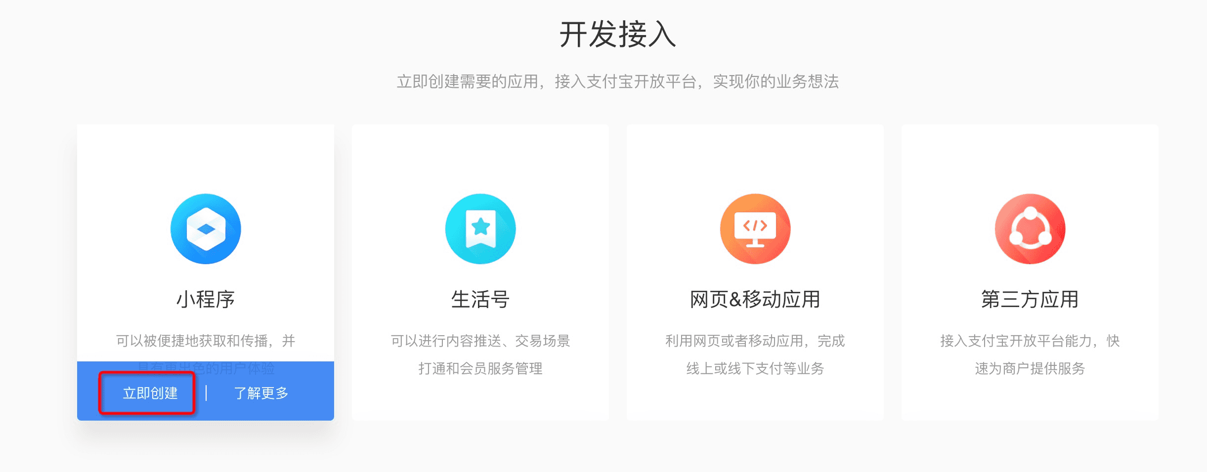 如果您尚未注册支付宝开发者账号,使用支付宝账号登录 蚂蚁金服开放平台,并完成开发者身份注册。详细信息请参见 开发者入驻说明。 创建支付宝小程序应用