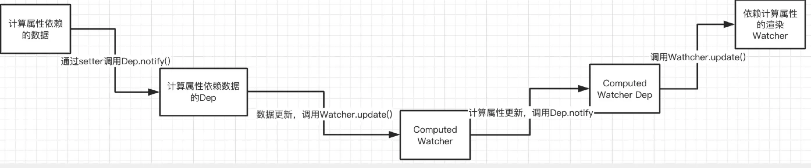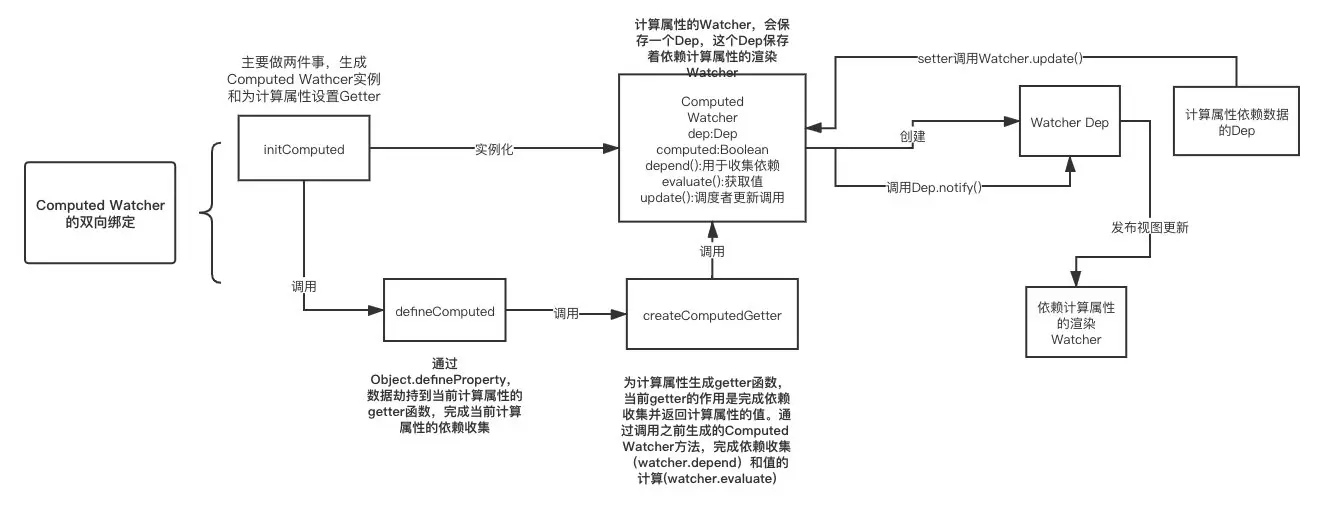 在defineReactive中,被劫持的数据会在getter中进行依赖收集,这里的作用也是进行依赖收集,并返回值 也就是说computed Watcher应该不仅保存着它依赖数据的Dep,还应该维护着一个Dep订阅者中心来保存依赖当前计算属性值的Watcher