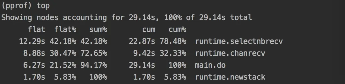 | flat% | 该函数占用CPU的耗时的百分比 | selectnbrecv耗时:12.29s,cpu总耗时:29.14,12.29/29.14=42.18 |
