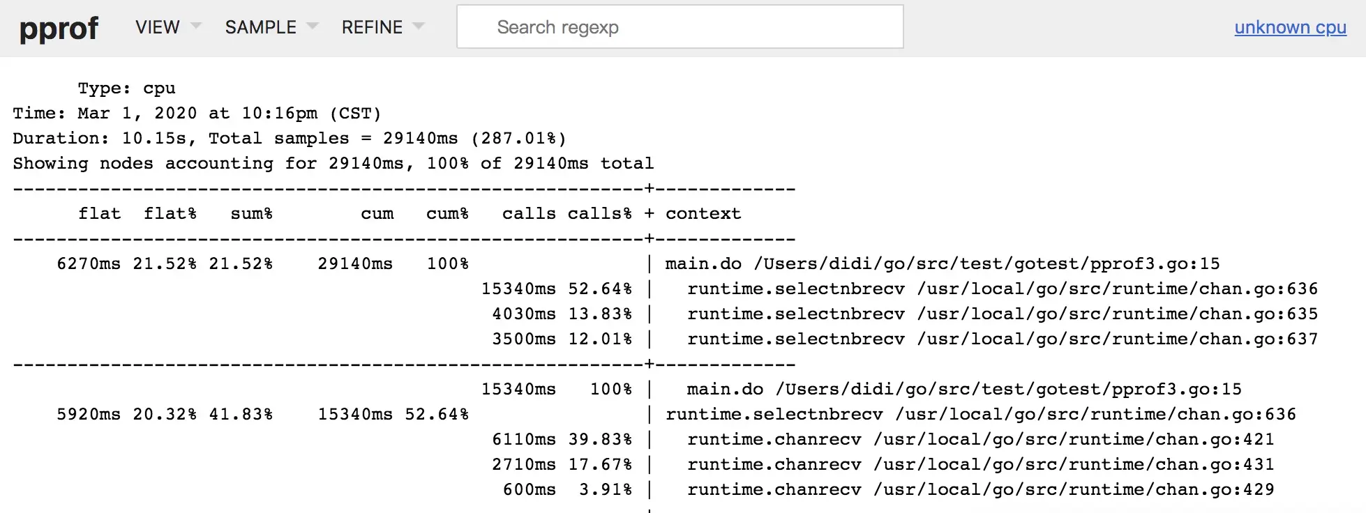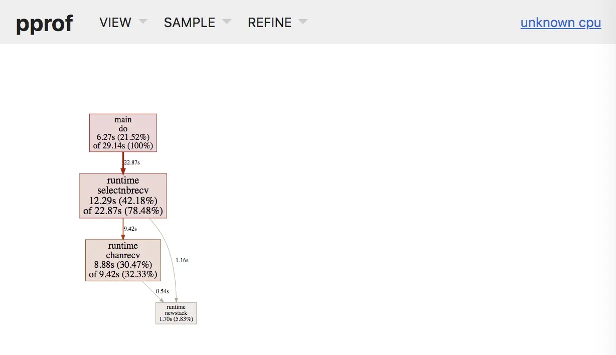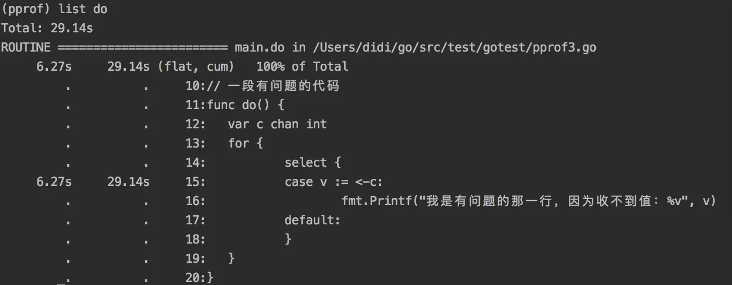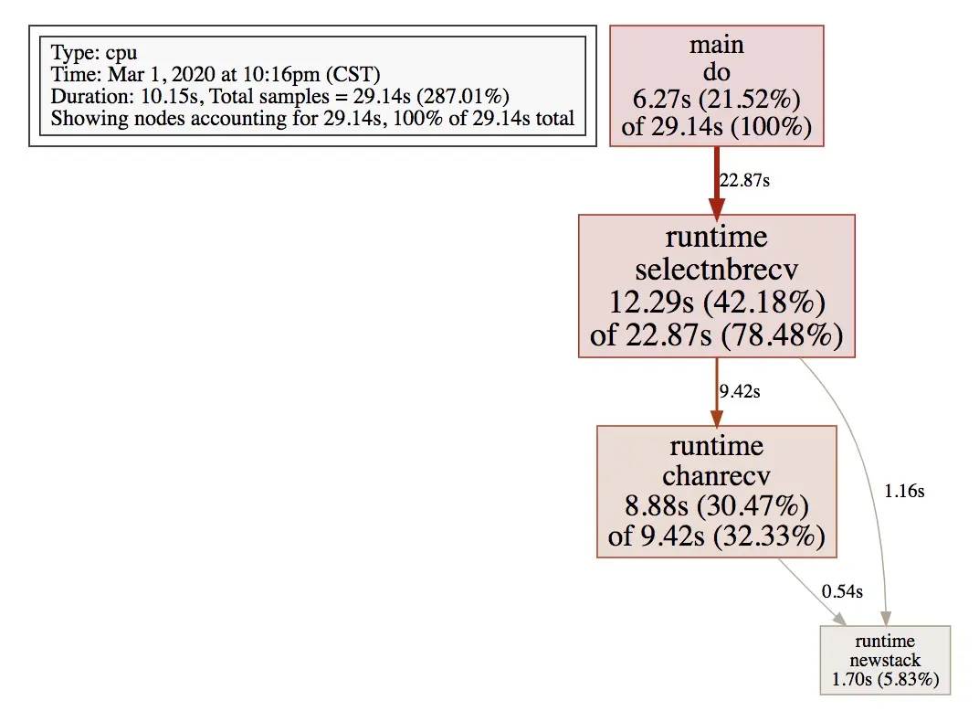 | flat | 该函数占用CPU的耗时 | selectnbrecv占用CPU的耗时是12.29s |