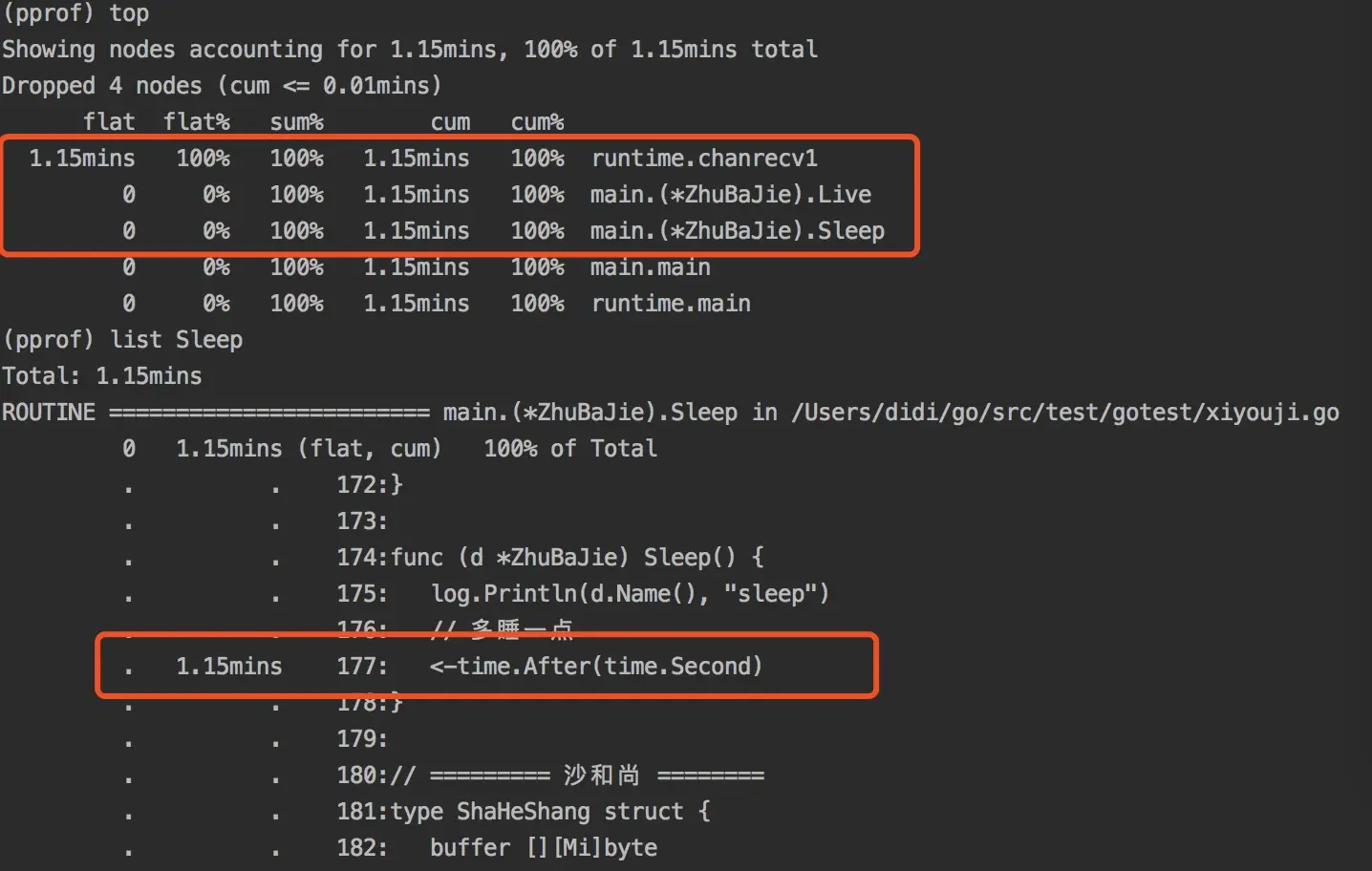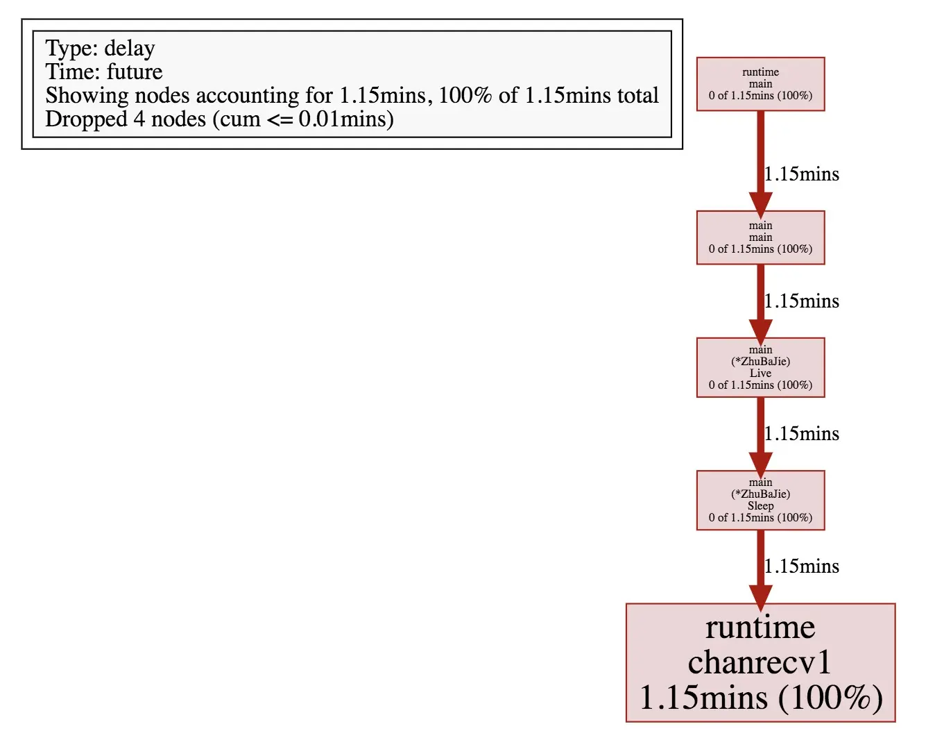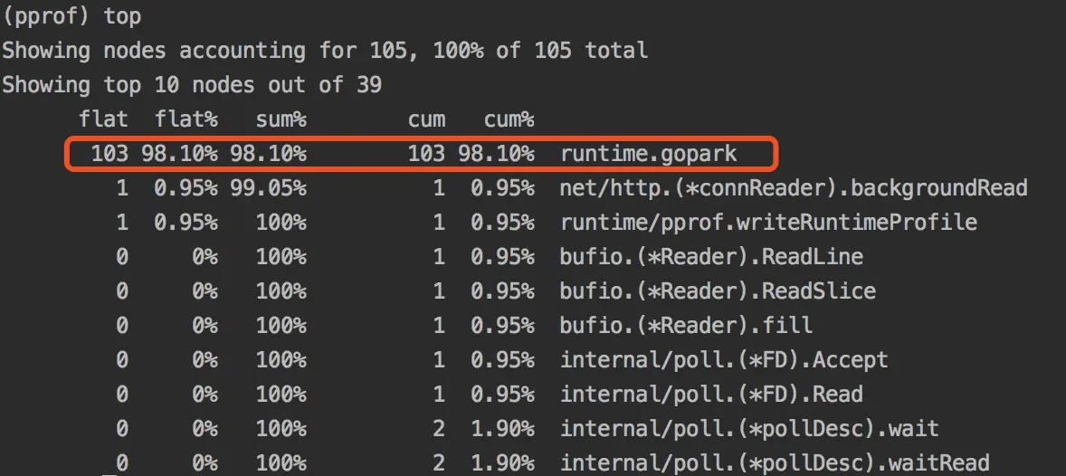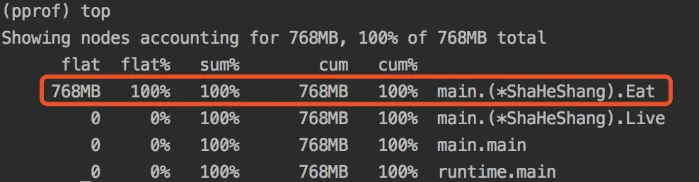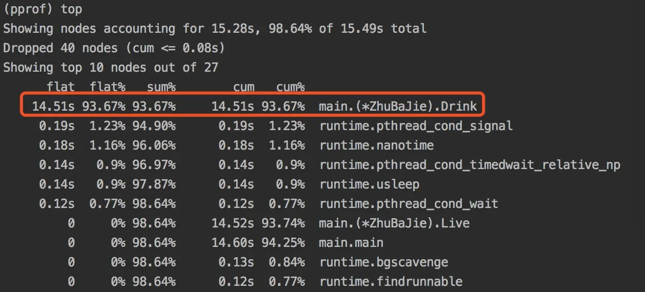 | sum% | top命令中排在它上面的函数以及本函数flat%之和 | chanrecv:42.18%+30.47% = 72.65% |