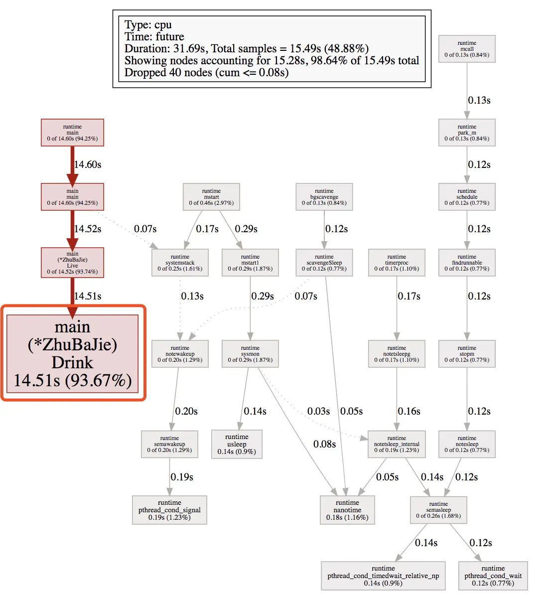 | cum | 当前函数加上该函数调用之前的累计CPU耗时 | chanrecv:8.88+0.54=9.42 |