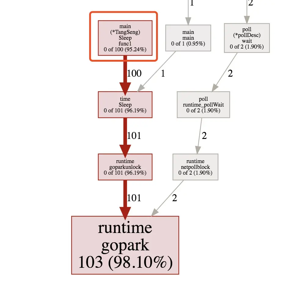 go tool pprof -pdf cpu.prof,会生成profile001.pdf的pdf文件。(参数可选text、pdf、svg)