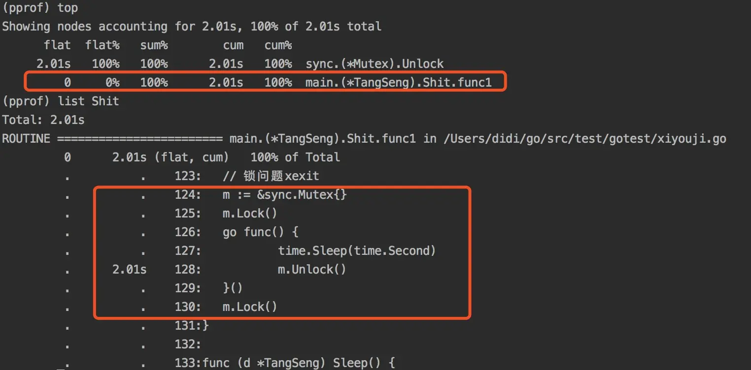 可以看到,126行主协程在进行lock加锁后,立马再次加锁,但是解锁由另一个协程去unlock,另一个协程足足休眠1s,这里会导致阻塞,造成锁争用问题。
