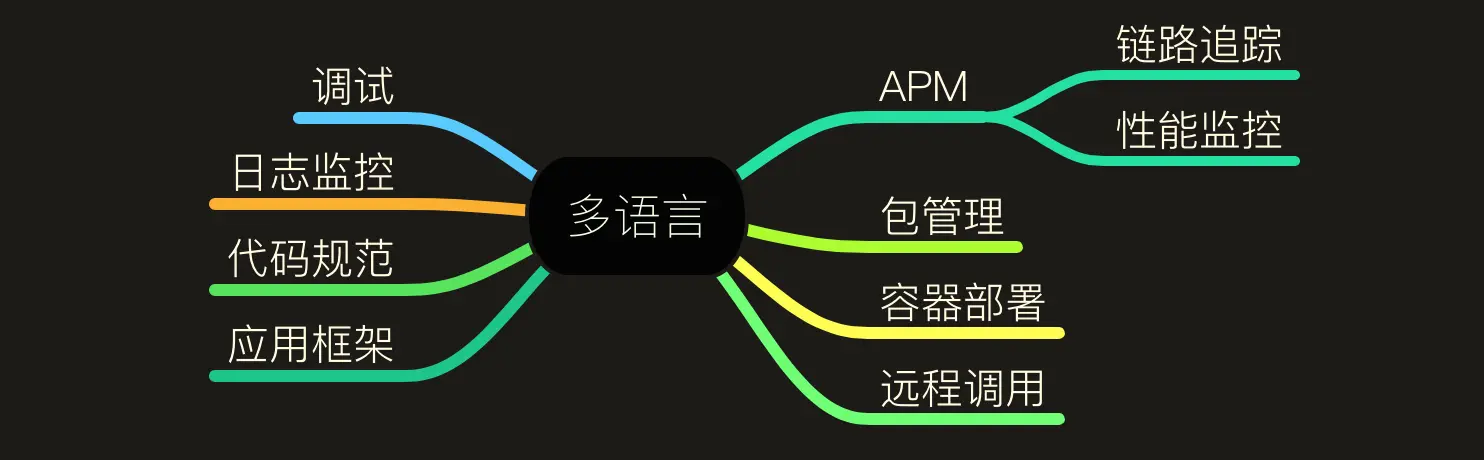 多语言是指我们提供一些规范、协议、框架、基础设施等等来支持开发者进行如Java、Php、Python、NodeJs等等语言的应用开发,并且我们的调用。
