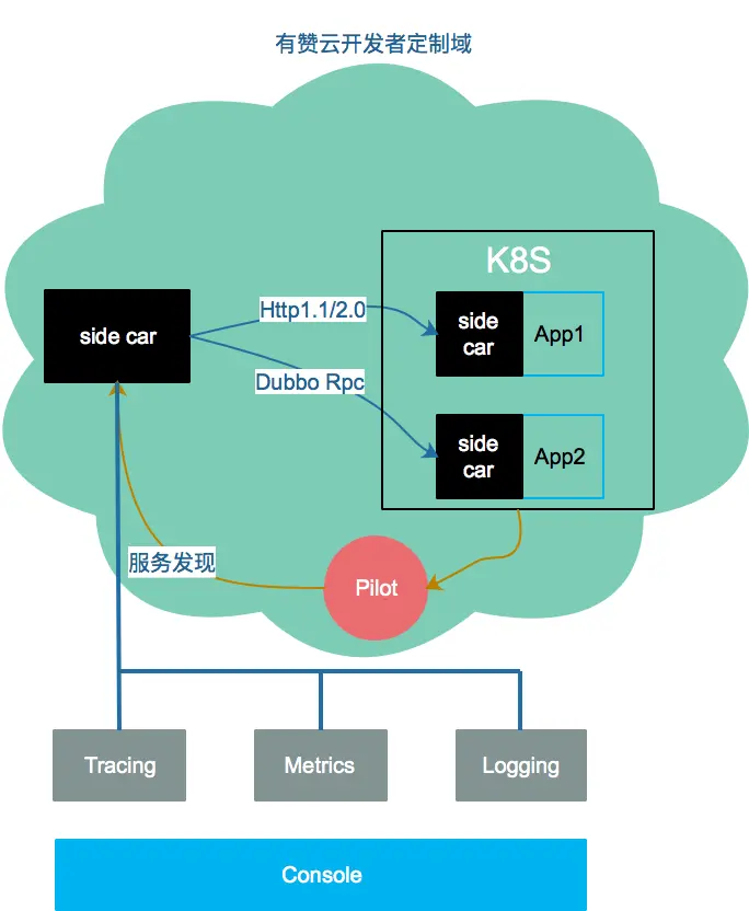 从上图中会发现,我们在核心域调用App的过程中没有采用Dubbo直连的方式进行RPC行为,而是通过了Side car进行转发。