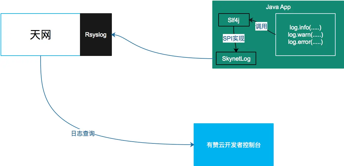 在应用框架层,已经封装好了日志协议和上报天网的逻辑,开发者只需要像平常使用Slf4j一样打印日志就行。