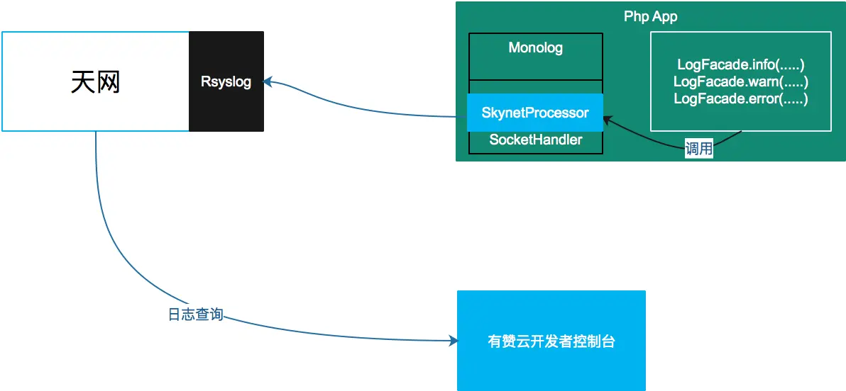 Php框架使用Monolog,在Monolog里增加了日志处理器SkynetProcessor来封装日志协议,通过SocketHandler来打印日志到Rsyslog上。