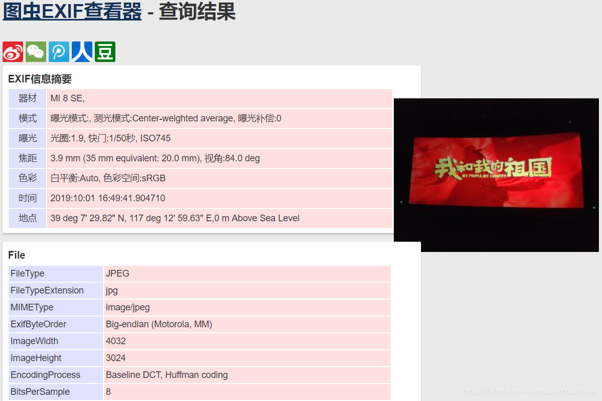 网上有很多的EXIF信息查看器,这里上传一张十月一日和朋友去观看的我和我的祖国这部电影的照片,没有任何的标志建筑背景,使用该工具进行尝试,可以很直观的看到拍照时间、手机型号、地理位置等信息,具体如下所示: