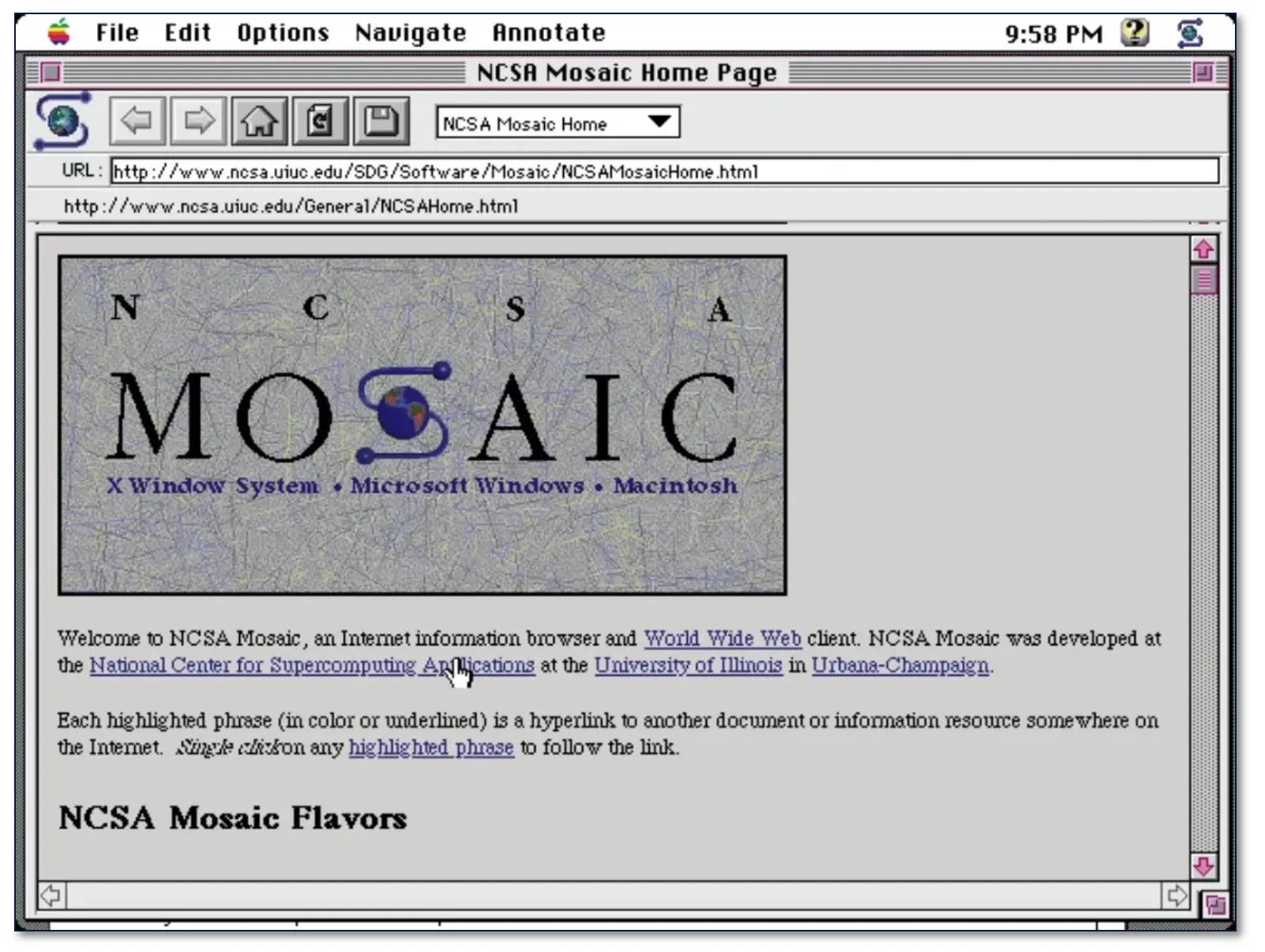 1993年,美国国家超级计算应用中心(NCSA)发布了第一款图形互联网浏览器Mosaic。它以 in-line(内联)等形式显示 HTML 的图像,在图像方面出色的表现使它迅速在世界范围内流行开来。同年秋天,Mosaic 的 Windows 版和 Macintosh 版面世。使用 CGI 技术的 NCSA Web 服务器、NCSA HTTPd 1.0 也差不多是在这个时期出现的。Mosaic的出现改变了人们不仅对浏览器的看法,而且改变了人们对万维网的看法,使成千上万的用户可以以更轻松地在网上冲浪。