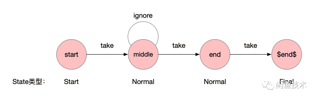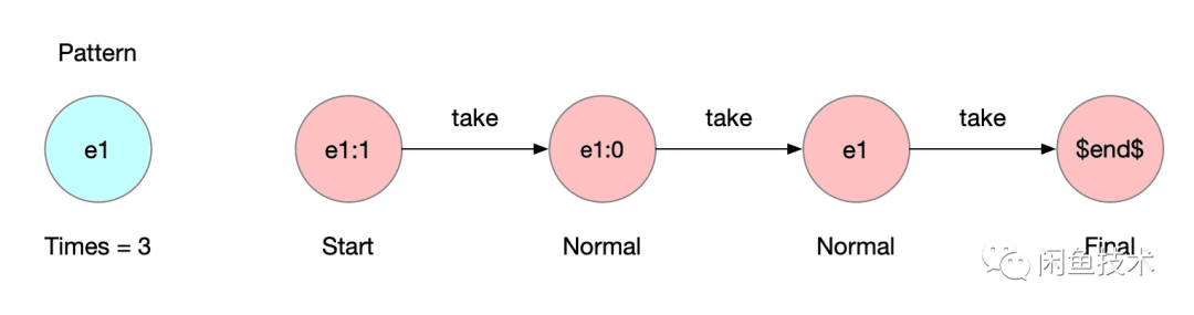 最终就会得到一个 Times=3 的Pattern,编译器在拿到这个Pattern之后,一样先创建一个$end$的Final节点,在处理times的时候,会创建重复的节点,只不过名称不同,不同的点之间用take链接起来,如下图所示: