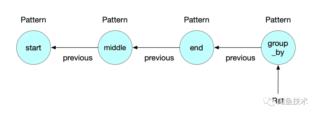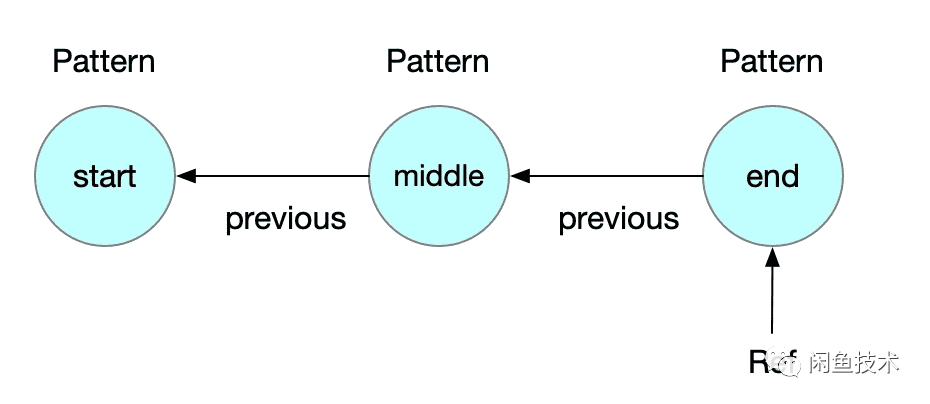 这个代码里面声明了3个Pattern,依次命名为 start 、 middle 、 end 。Pattern里面保存了指向前面节点的引用 previous ,整个Pattern链表构建完如下图所示:
