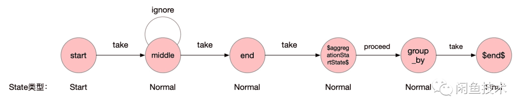 group_by 节点的时候,我们需要做个特殊处理,判断如果有聚合节点,我们就需要再 $end$ 节点和前面节点之间插入一个聚合的节点和哨兵位节点,哨兵位节点命名为 $aggregationStartState$ ,最终效果如下图所示: