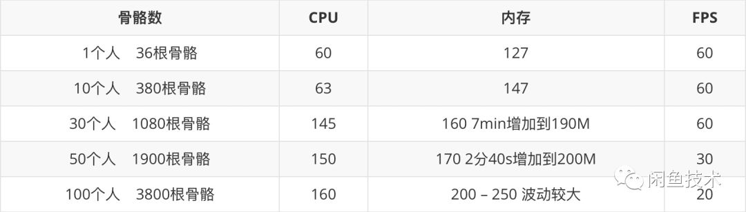 骨骼数量能一定程度上也能衡量动画的复杂度(还与变换次数相关),可以发现大于1000根骨骼时性能开始出现衰减,并随着骨骼数量的增加逐渐明显,在3000根骨骼以上时出现明显卡顿。这一性能已经完全可以满足App中内嵌中小型游戏的需求(其中内存增加问题会在后续的性能篇中进行阐述)。