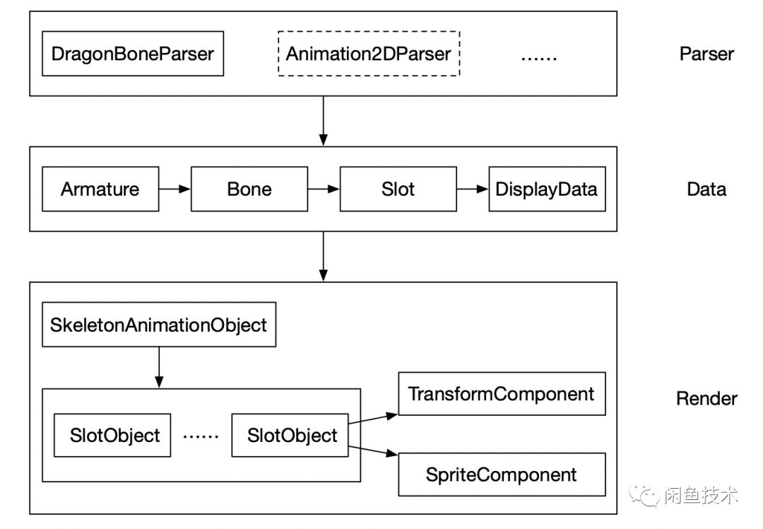 Parser层:考虑到骨骼动画的编辑器有很多,为了兼容市面上不同的编辑器,我们增加了一层解析层将不同编辑器生成的产物,转化为我们预定好的相对通用的骨骼结构数据。