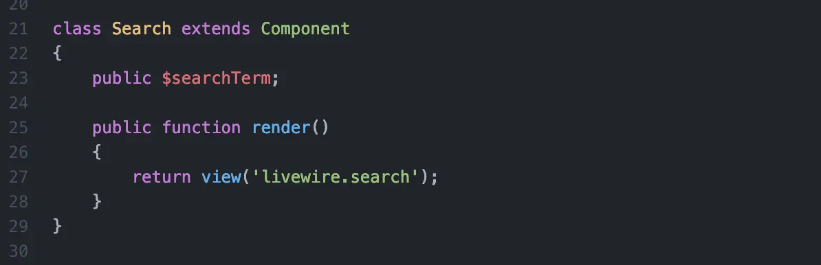 通过设置 wire:model="searchTerm" Livewire 将自动更新 Search.php 控制器中名为 $searchTerm 的公共变量。 现在我们来添加一下: