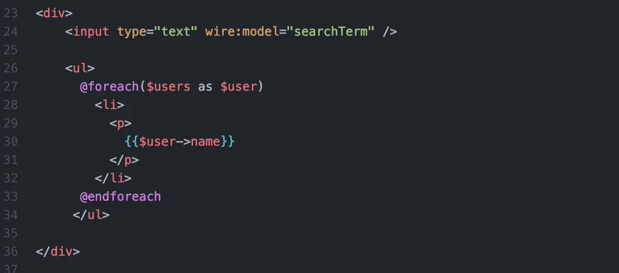 现在当页面渲染时,它将向搜索视图传递一个名为 $users 的变量。 我们可以像平常一样使用 Blade,循环遍历所有用户: