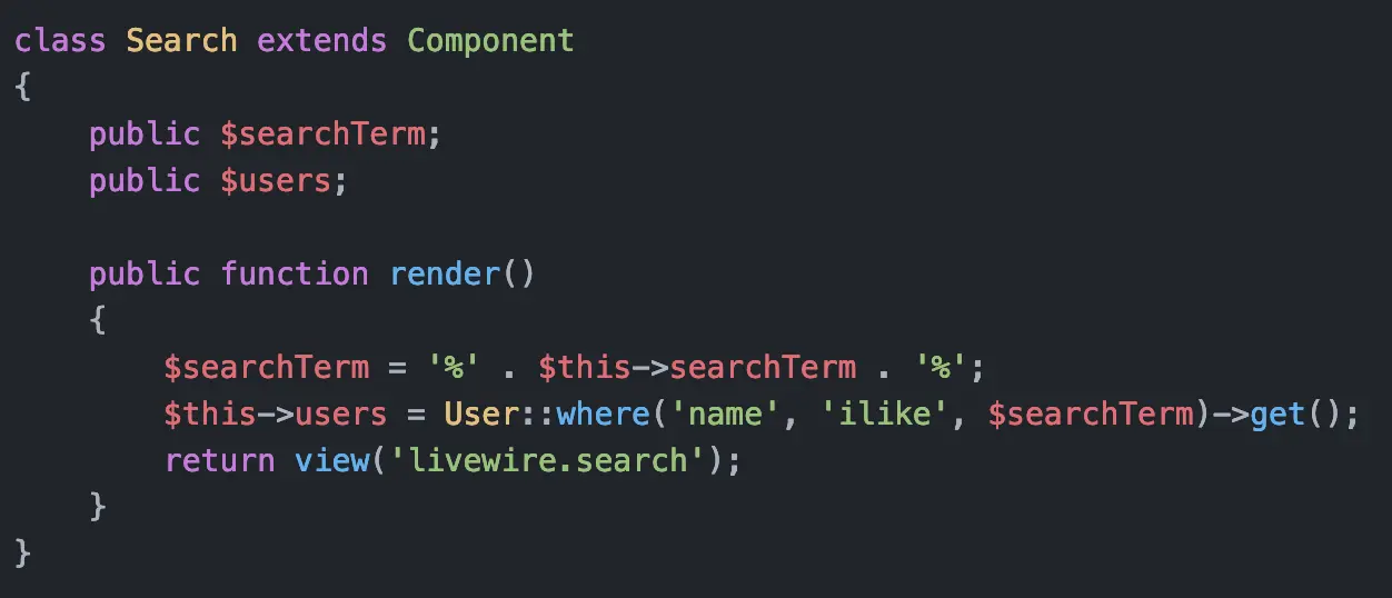 Livewire 的工作原理是将前端 Livewire 组件中的数据直接连接到后端 Livewire 控制器。然后,这些控制器可以重新呈现组件,而不需要重新加载整个页面。我们的目标是将搜索查询从输入表单传递到后端,然后使用它来搜索我们的 Eloquent 模型。每次搜索将更新页面上显示的数据!